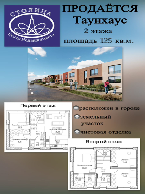 Таунхаус в КП Урман, 125 кв.м., в предчистовой отделке, 2х этажный, на первом этаже просторная гостиная с выходом на земельный участок + спальная, санузел, на втором 2 детских спальни + мастер спальная, 2 санузла, выгодное расположение в секции С, 3 я от Рамуса, статус квартиры.