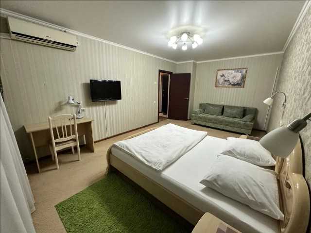 Зал: кондиционер, 2х спальная кровать, 2 прикроватные тумбы, письменный стол, стул, телевизор, 2 коврика, занавески, люстра, 2 бра, диван, картина.